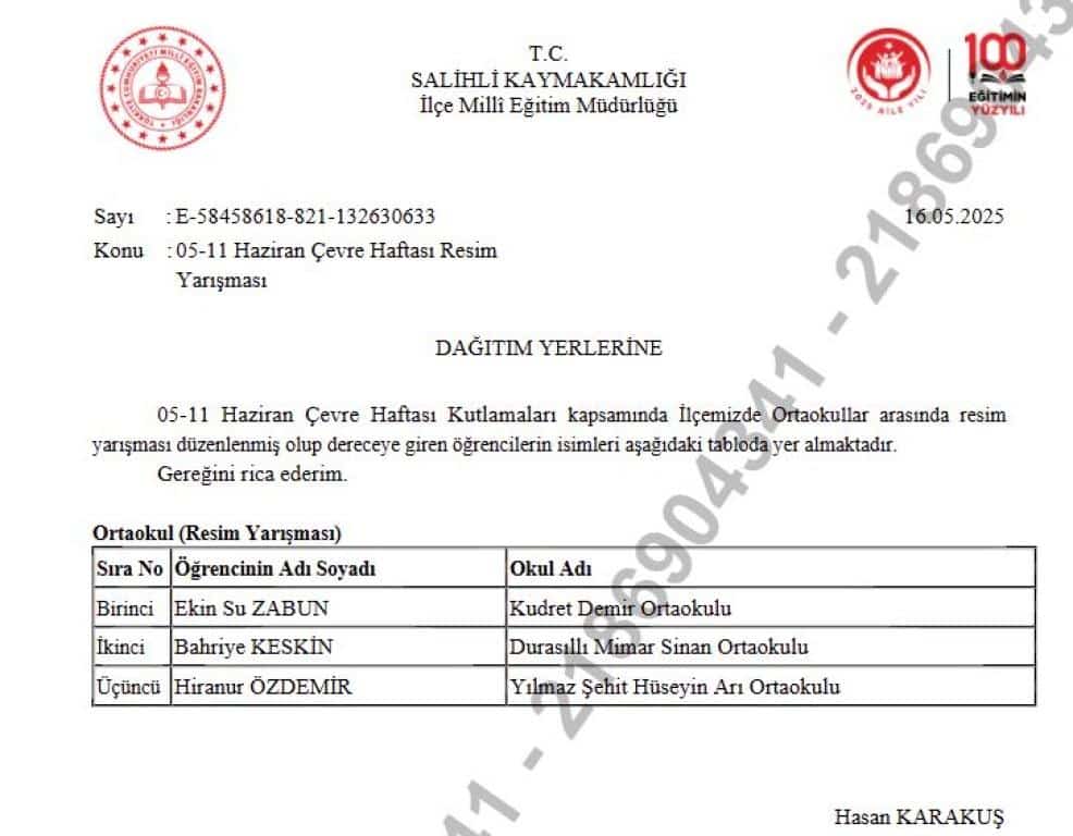 19 Mayıs Atatürk'ü Anma, Gençlik ve Spor Bayramı Şiir Yarışması'nda 3. olan 6.Sınıf öğrencimiz Şengül BARCA'ya ve Çevre Haftası Resim Yarışması'nda 2.olan 6.Sınıf öğrencimiz Bahriye KESKİN'e Okul Müdürümüz Muhammet Mustafa DEMİR Başarı Belgelerini takdim etmiştir. Öğrencilerimizi ve öğretmenlerimizi tebrik ederiz.